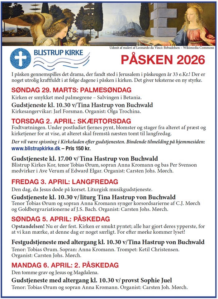 Hermed en oversigt over gudstjenester i påskedagene i Blistrup Kirke, der starter med Palmesøndag 29/3, Skærtorsdag med efterfølgende påskemåltid (+ tilmelding) 2/4, Langfredag 3/4, Påskedag 5/4 og 2. påskedag 6/4 2026.